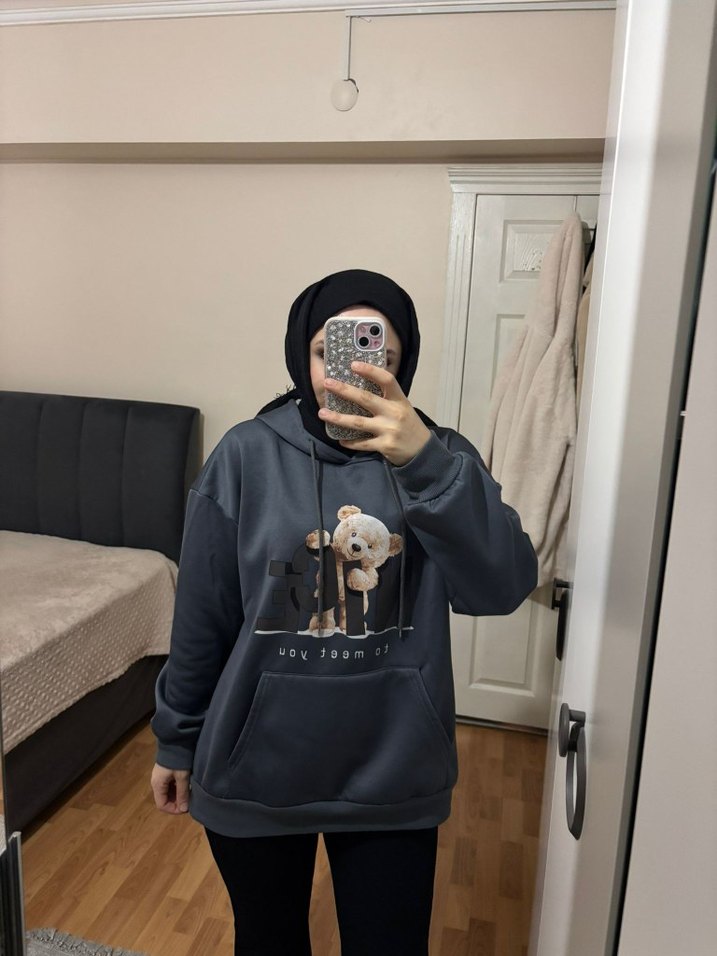 Yumuşak kumaştan, kapüşonlu ve oversize kesime sahip gri sweatshirt, baskılı ayıcık deseniyle rahat bir sokak stili sunar.