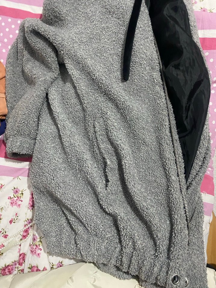 Gri kapüşonlu ceket, yumuşak ve sıcak kumaşa sahip, rahat kesim ve fermuarlı ön detaylıdır. Uzun kollu, midi boyda ve günlük kullanıma uygundur. (pazarlık yaparız yeterki alın)