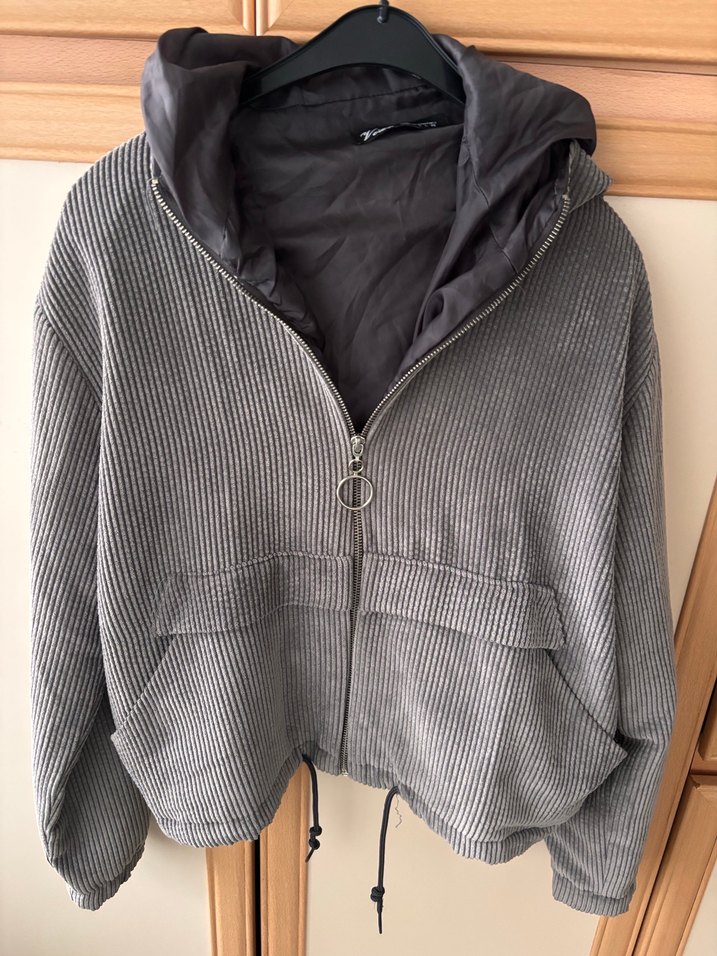 Gri keten kumaştan, kapüşonlu ve fermuarlı, rahat kesim kadın ceket. Günlük kullanıma uygun, sokak stili görünümü sağlar.