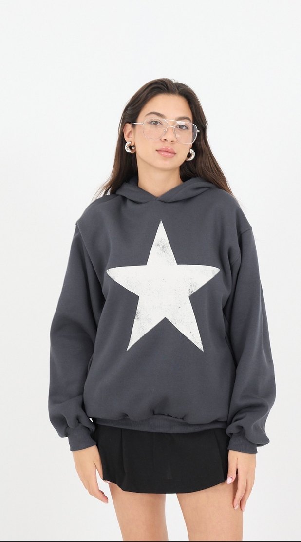Gri kapüşonlu sweatshirt, rahat kesim ve önünde büyük beyaz yıldız baskısı bulunuyor. Uzun kollu, yumuşak ve günlük kullanıma uygun kumaştan yapılmıştır. ⭐