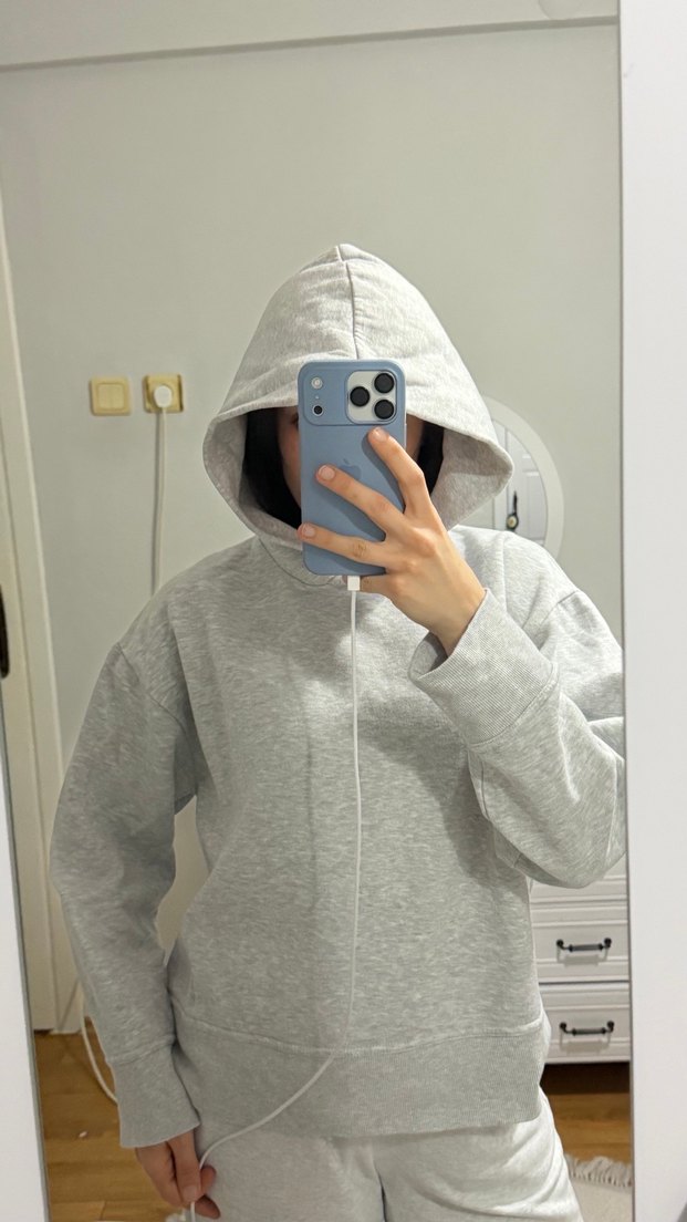 Gri renk, kapüşonlu ve bol kesim uzun kollu sweatshirt, yumuşak ve sıcak kumaştan üretilmiştir. Günlük kullanıma uygun sade tasarımlıdır.