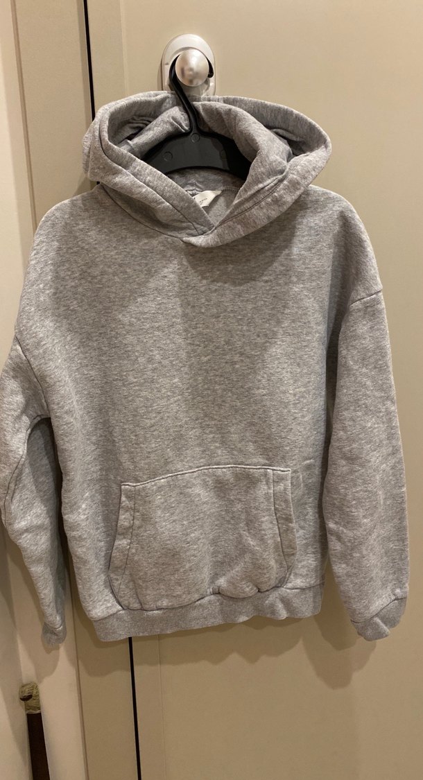 Gri kapüşonlu sweatshirt, uzun kollu ve bol kesim. Yumuşak ve sıcak kumaştan, desensiz ve ön cep detaylıdır. Rahat günlük kullanım için uygundur.