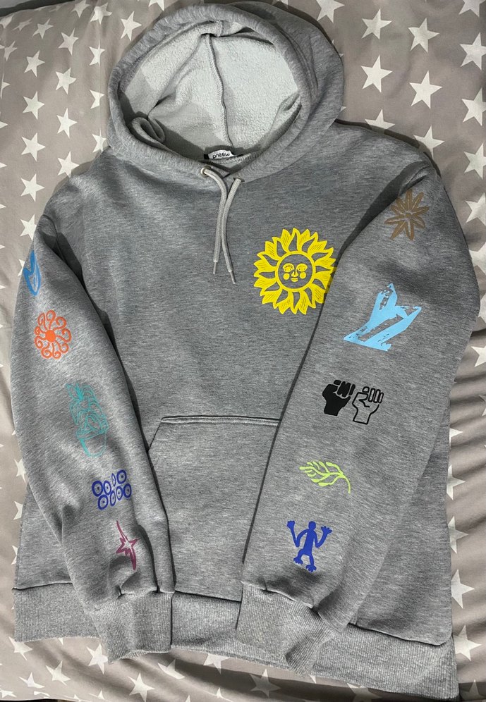 Gri renkte, uzun kollu, kapüşonlu ve desenli kadın sweatshirt. Renkli baskılarla süslenmiş, rahat ve normal boyda bir model.