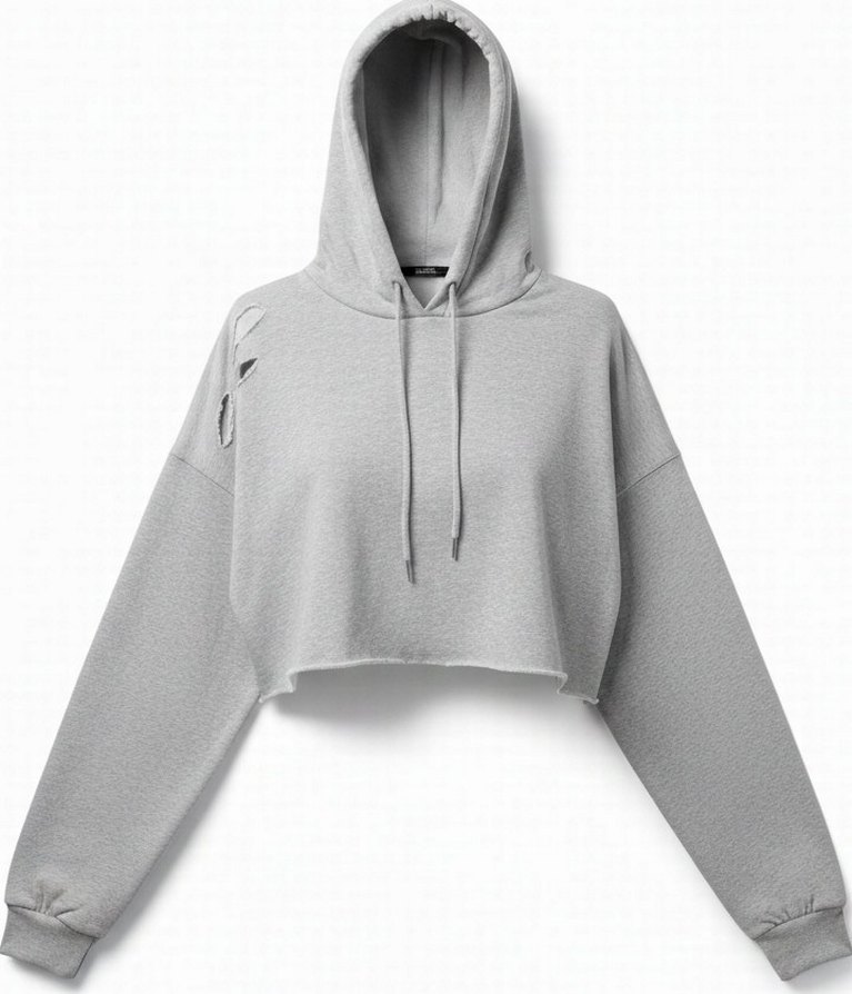 Gri kapüşonlu, uzun kollu, yumuşak dokulu salaş kadın sweatshirt. Kısa kesim ve yırtık detaylı, rahat sokak tarzı için uygun.