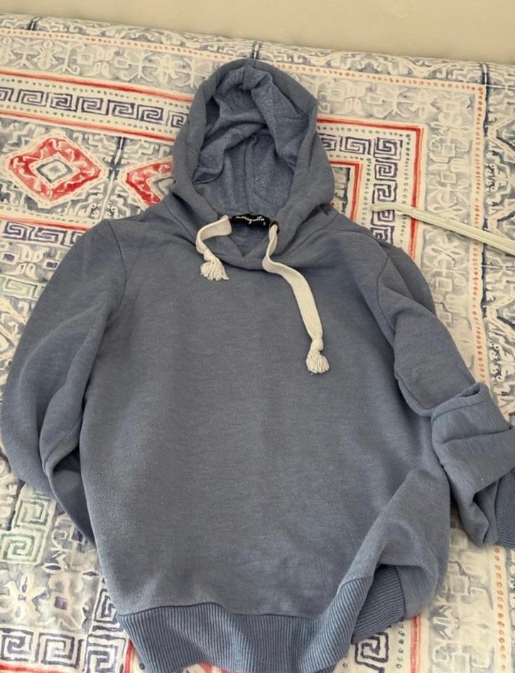 Gri kapüşonlu sweatshirt, uzun kollu ve salaş kesimdir. Yumuşak örme kumaştan üretilmiş olup günlük rahat kullanıma uygundur.