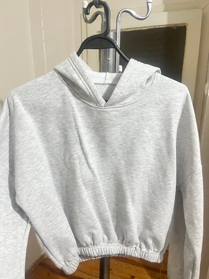 Gri kapüşonlu, uzun kollu ve lastikli bel detaylı salaş sweatshirt. Yumuşak ve sıcak kumaştan günlük rahatlık sağlar.