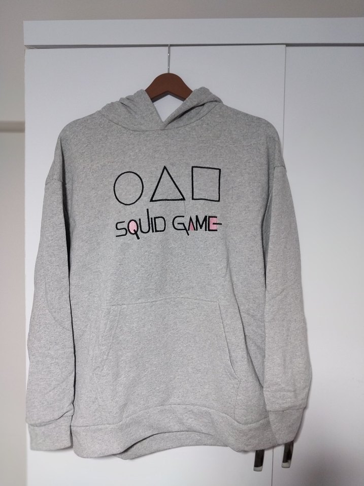 Gri kapüşonlu, uzun kollu ve baskılı Squid Game desenli bol kesim sweatshirt. Yumuşak ve sıcak kumaştan, kanguru cepli rahat tasarım