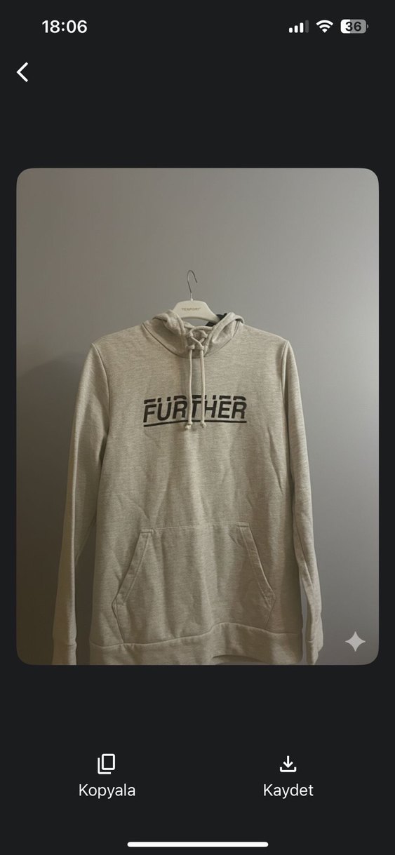 Gri renk, uzun kollu ve kapüşonlu, bol kesim sweatshirt. Günlük rahat kullanım için uygundur. M beden. Hiç kullanılmadı.