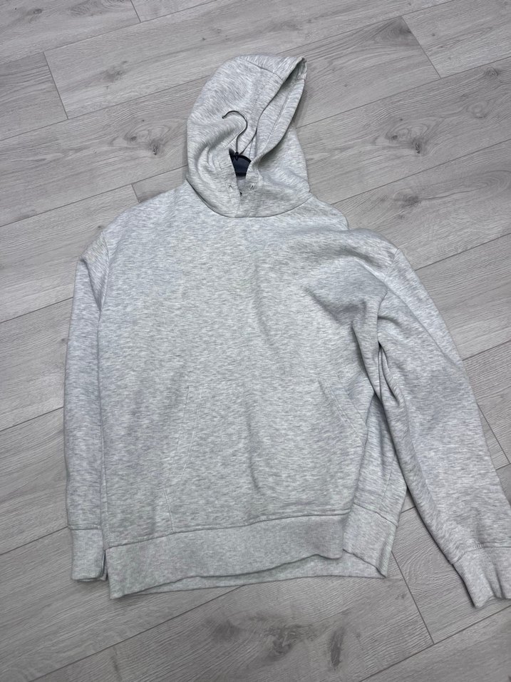 Gri kapüşonlu sweatshirt, bol kesim ve uzun kollu, yumuşak ve sıcak kumaştan. Desensiz sade tasarımıyla günlük kullanım için uygundur.