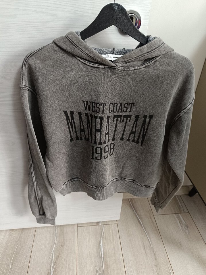 Gri renkli, uzun kollu, yuvarlak yakalı, "West Coast Manhattan 1998" desenli bol kesim sweatshirt. çok az kullanıldı deformesi yok
