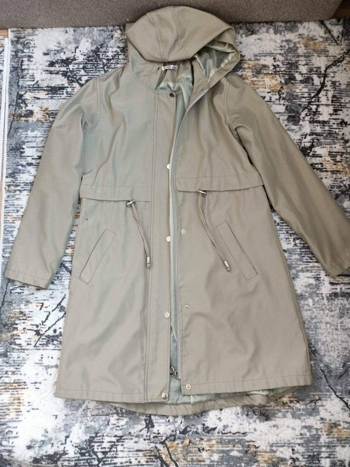Gri renkte, sentetik kumaştan yapılmış, uzun ve bol kesim kadın ceketi. Kapüşonlu ve uzun kolludur. Sokak modasına uygundur.