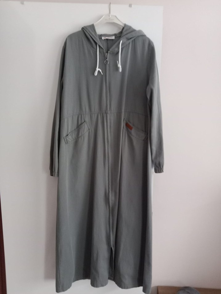 Gri renkte, kapüşonlu ve fermuarlı uzun kadın pardesü. Keten kumaştan, bol kesim ve uzun kolludur, günlük rahat kullanıma uygundur. İki cepli ve desensizdir. Deformasyonu yoktur. Boyu 135 cm dir.