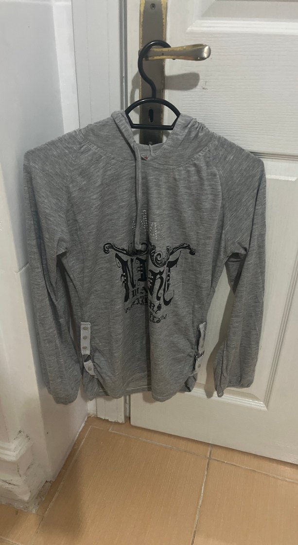 Gri renkte, uzun kollu ve kapüşonlu, baskılı desenli, kemerli detaylı bol kesim kadın sweatshirt. Yumuşak keten kumaştan üretilmiştir, günlük sokak stiline uygundur.
