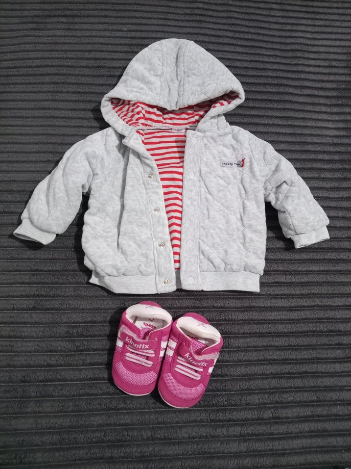 3-6 ay kız bebek ceket ve ayakkabı 17 numara Gri kapüşonlu, uzun kollu ve cırt cırtlı bebek kız ceketi ile pembe bebek ayakkabısı takımı. Ceket yumuşak, kapitone dokuludur ve çizgili astara sahiptir.