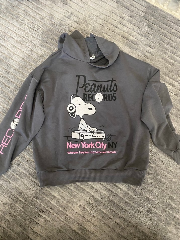 Gevşek kesim, kapüşonlu uzun kollu kız sweatshirtü, Snoopy ve New York City yazılı baskıya sahip. Düğmeli ve yumuşak, sıcak kumaştan üretilmiştir.
