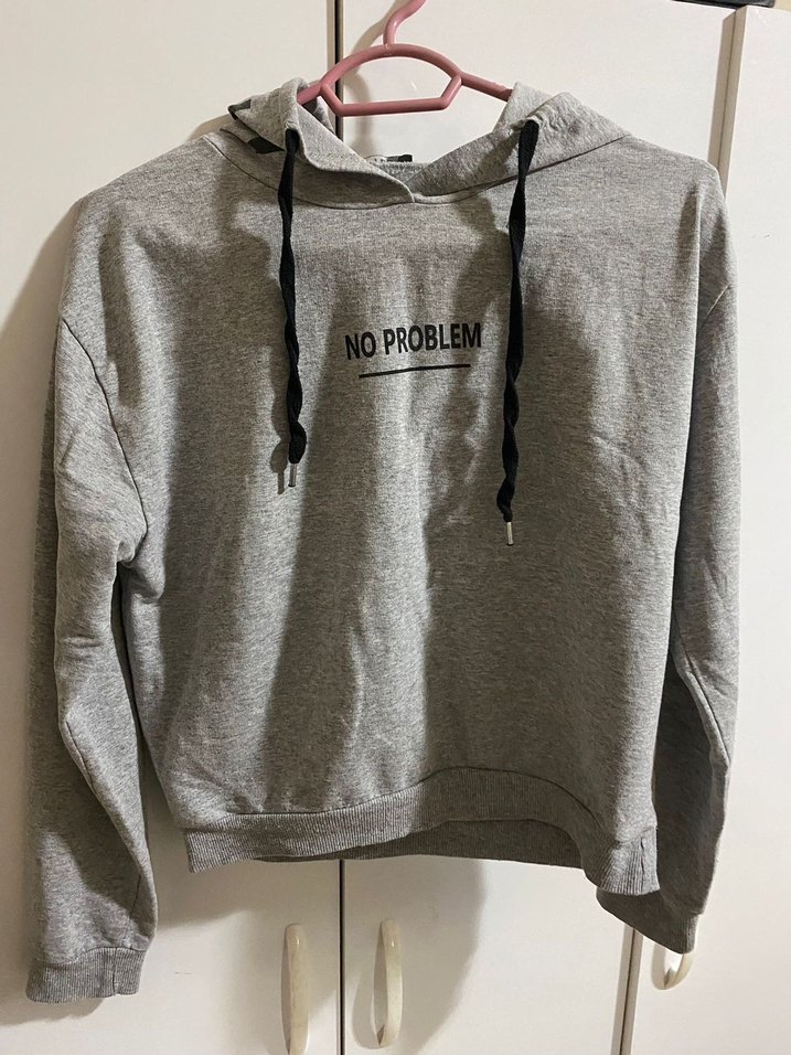 Gri kapüşonlu sweatshirt, uzun kollu ve rahat kesimlidir. Yumuşak, sıcak tutan kumaşı ve önündeki 'NO PROBLEM' yazısı ile günlük kullanıma uygundur.