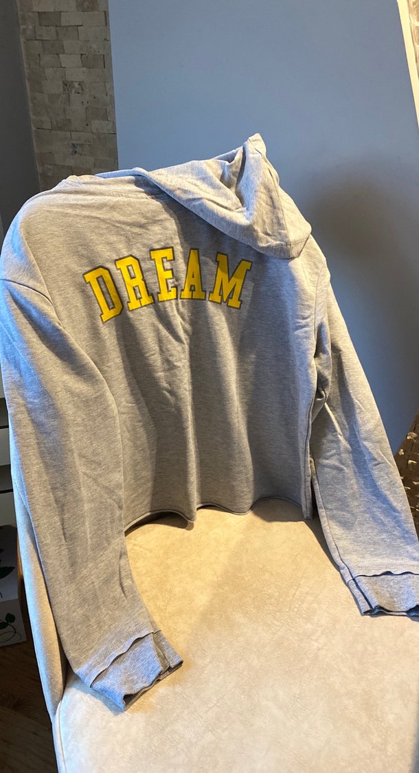 Gri, uzun kollu, kapüşonlu, bol kesim sweatshirt. "DREAM" baskılı, yumuşak kumaştan yapılmıştır.