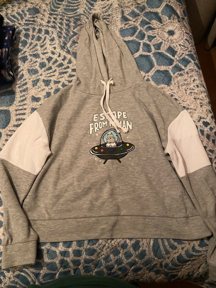 Gri kapüşonlu sweatshirt, uzun kollu ve beyaz örgü detaylıdır. Önünde "ESHIPE FROM HAN" baskılı uzay gemisi deseni vardır. Rahat kesimi ve yumuşak kumaşıyla günlük kullanıma uygundur.