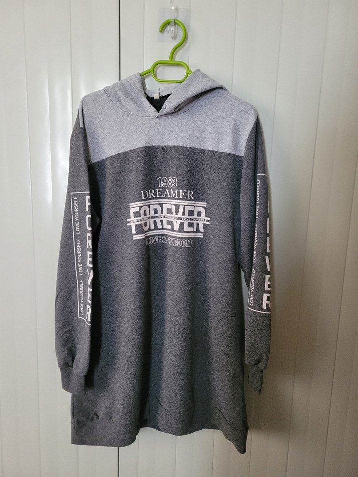 Gri renkli, uzun kollu ve kapüşonlu, bol kesim sweatshirt. Üzerinde "DREAMER" baskısı bulunur, günlük kullanım için uygundur.