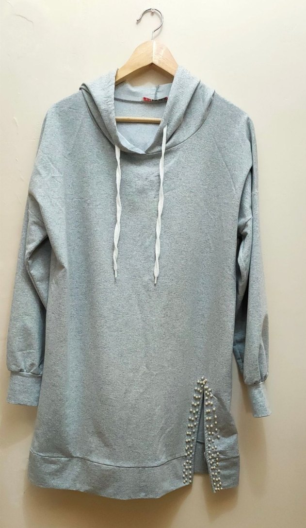 Gri kapüşonlu sweatshirt, uzun kollu ve bol kesimdir. Alt kısmında incili detay bulunur. Yumuşak triko kumaştan üretilmiş, günlük sokak stiline uygundur.