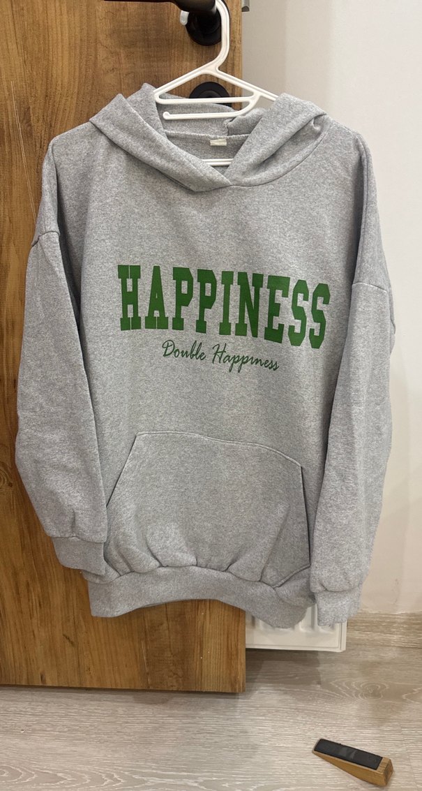 Gri renkte kapüşonlu, uzun kollu ve bol kesim sweatshirt. Önünde yeşil "HAPPINESS" baskısı bulunur. Yumuşak ve sıcak kumaştan, rahat sokak stili için uygundur.