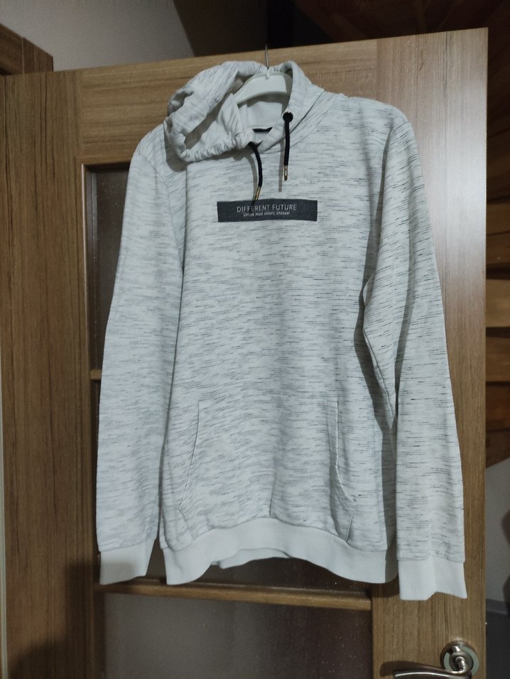 Gri, uzun kollu, kapüşonlu sweatshirt, yumuşak sentetik kumaştan, baskılı detaylı ve rahat kesim. Günlük sokak stili için uygun.