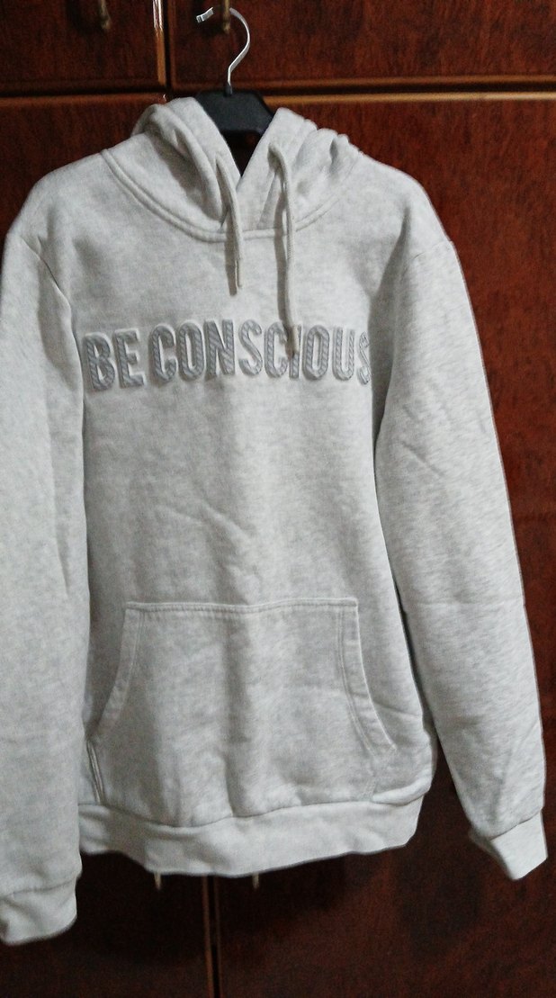 Gri renkte, yumuşak kumaştan yapılmış uzun kollu, kapüşonlu ve bol kesim bir sweatshirt. "BE CONSCIOUS" baskısı ile rahat sokak stili sunar.