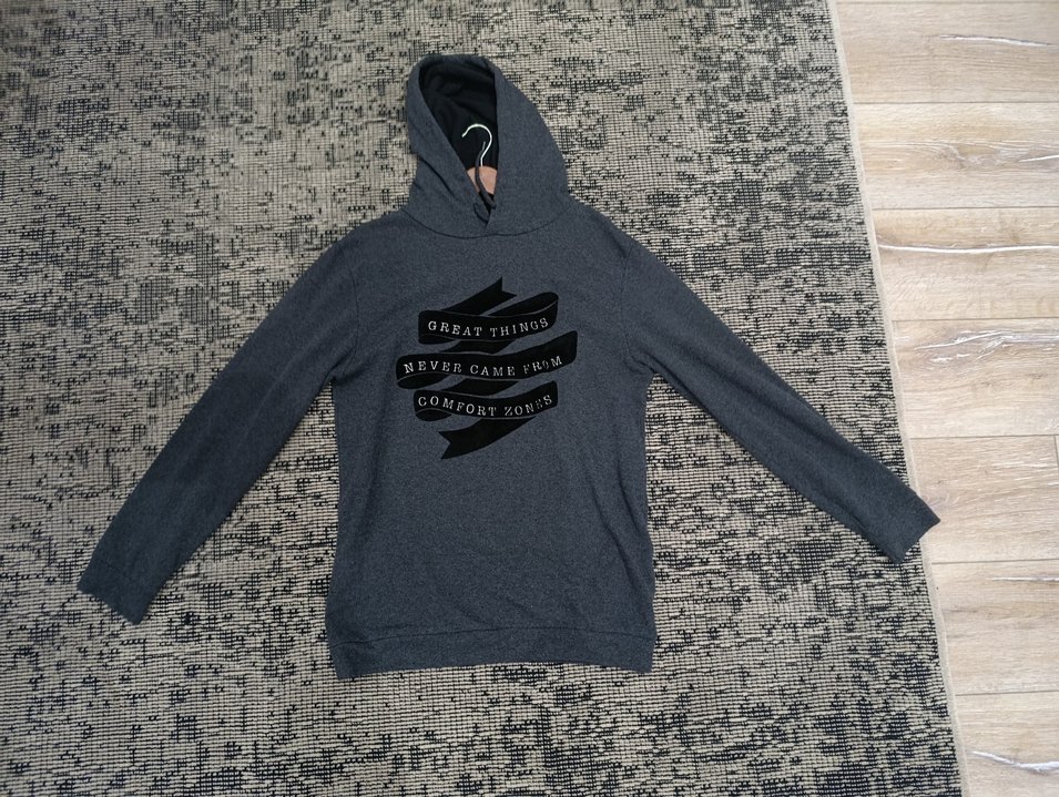 Gri kapüşonlu sweatshirt, uzun kollu ve rahat kesimlidir. baskılı detaylara sahiptir ve günlük kullanım için uygundur.