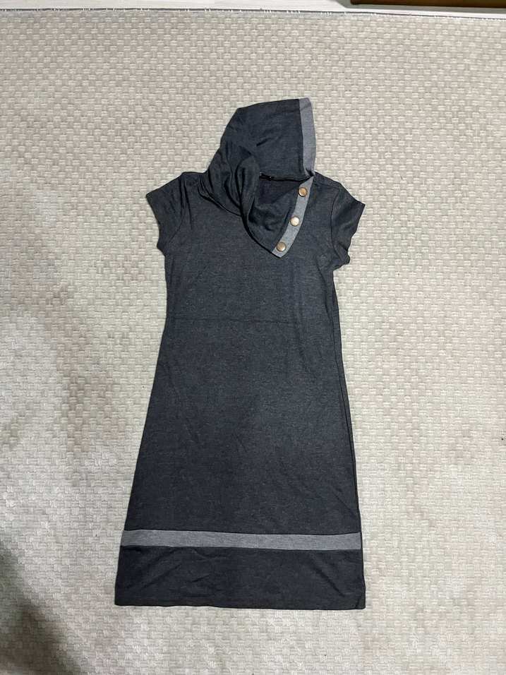 Kolsuz, gri renkte, yüksek yakalı ve düğmeli kapüşon detaylı, vücuda oturan spor tarzda uzun elbisedir. Günlük kullanıma uygundur.