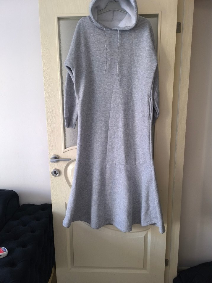 Gri, kapüşonlu, uzun kollu, bol kesim elbise. Yumuşak ve sıcak kumaştan, rahat kullanıma uygun.