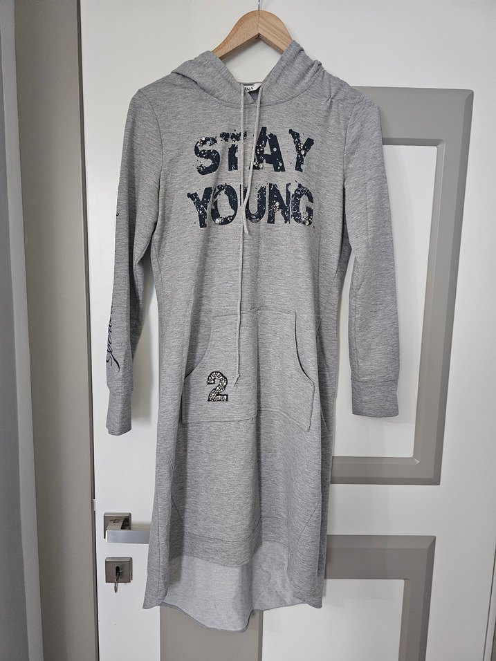 Gri renkli, uzun kollu, kapüşonlu sweatshirtü, bol kesim ve 'STAY YOUNG' baskılıdır. Yumuşak sentetik örme kumaştan üretilmiş, kanguru cepli.