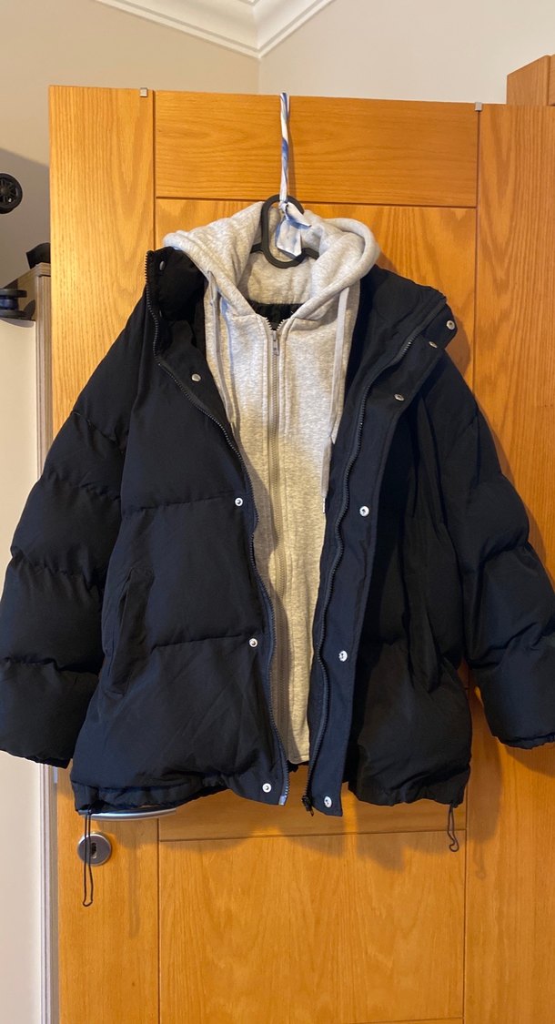 Gri kapüşonlu yumuşak kumaş ve siyah mont, bol kesim, uzun kollu ve yüksek yakalıdır. Günlük rahat ve sıcak tutar.