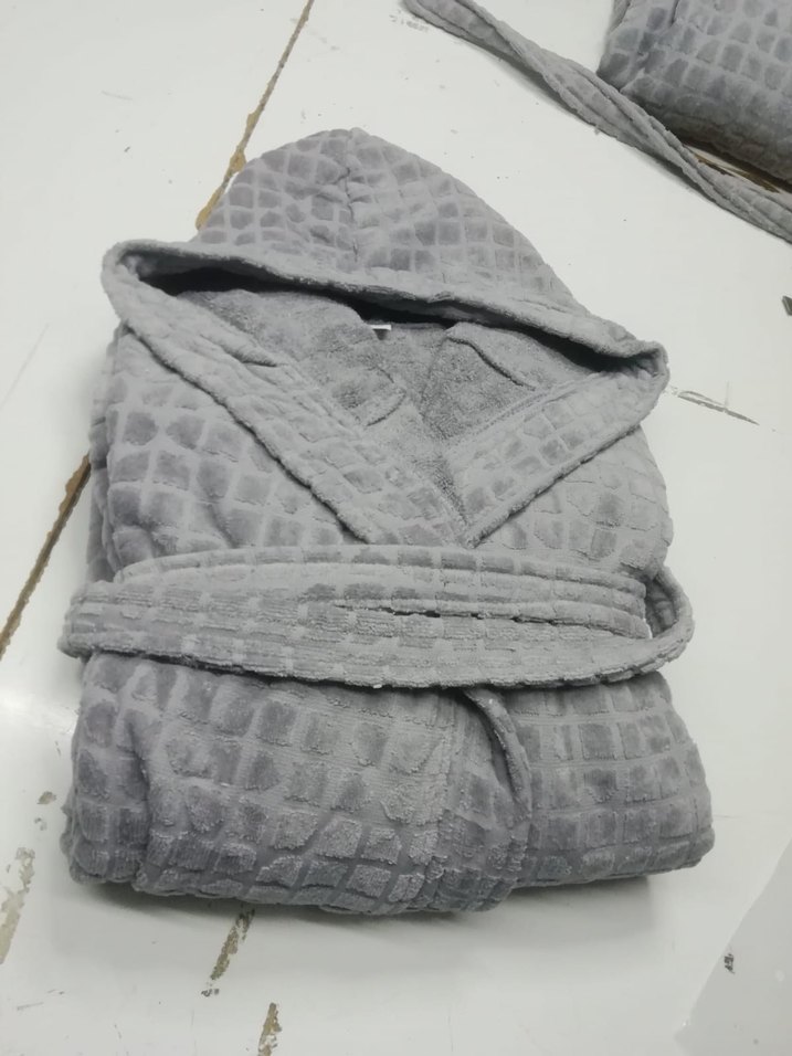 Gri renkte, yılan desenli dokulu kapüşonlu bornoz. Kemerli ve yumuşak dokusuyla rahat kullanım sağlar.