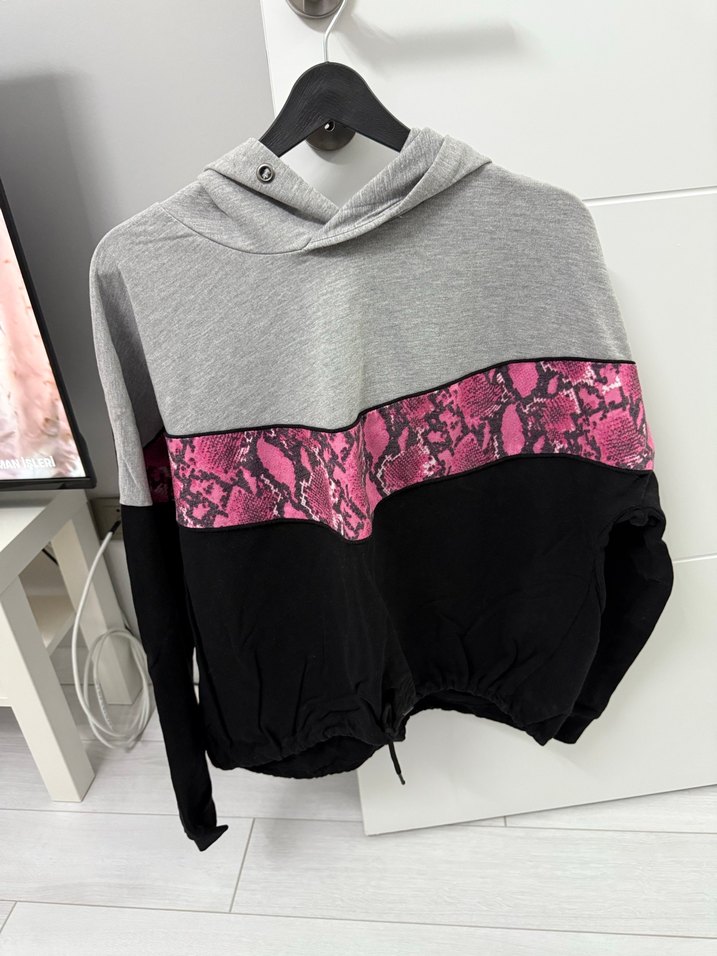 Gri ve siyah renk bloklu, pembe yılan desenli şeritli, kapüşonlu ve düğmeli, sentetik kumaştan yapılmış bol kesim kısa sweatshirt.