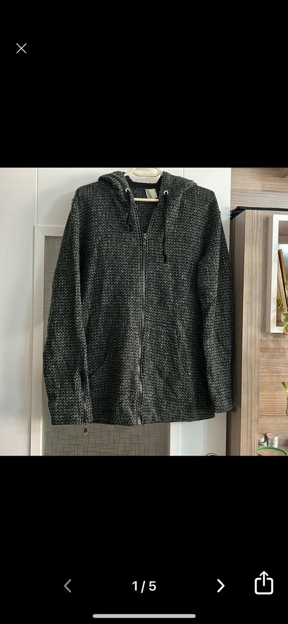 Bu rahat kadın ceketi fermuarlı ön ve kapüşonlu yakaya sahiptir. Yumuşak yünden yapılmış, uzun kollu ve bol kesimdir. Gri rengi ve midi boyu günlük sokak stili için uygundur.