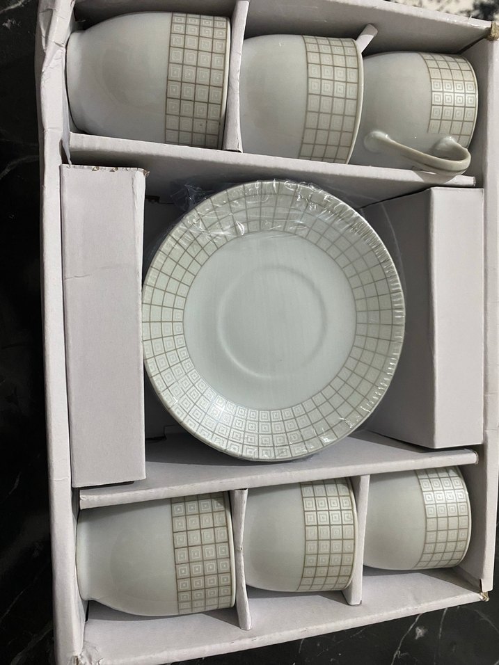 Gri kare desenli beyaz fincanlar ve tabaklar, sıcak içecek servisi için uygundur. Set 6 fincan ve tabaktan oluşmaktadır. ☕