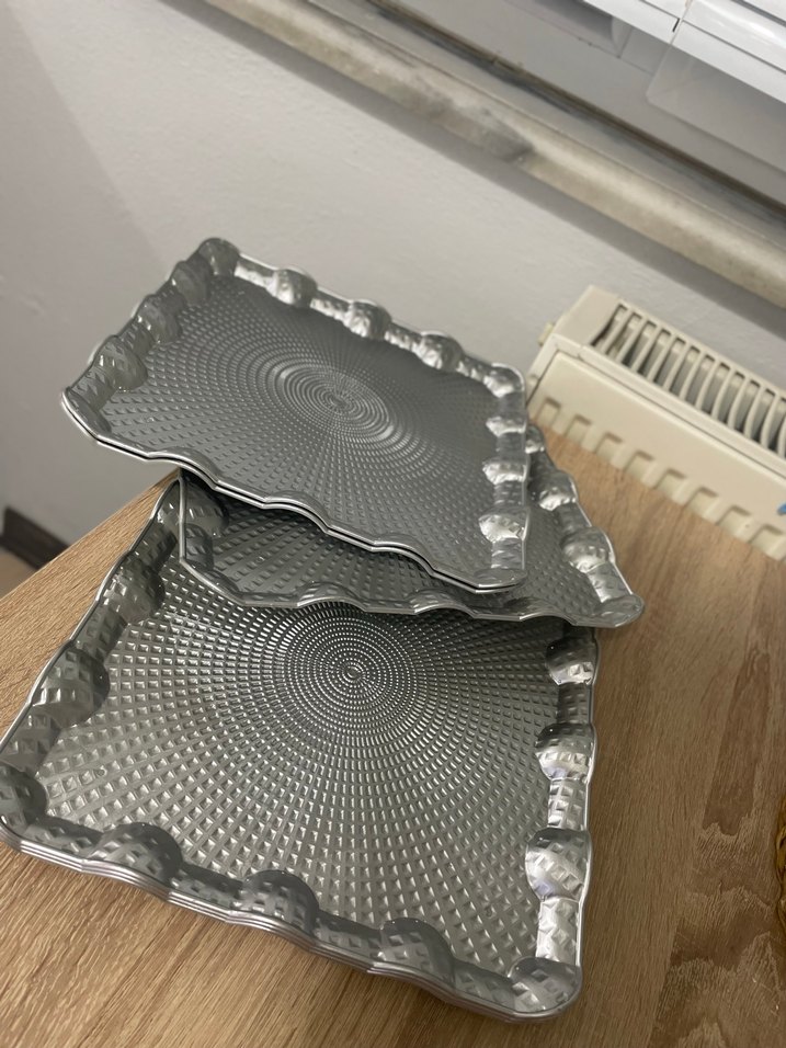 Gri kare sunum tepsisi, dokulu desenli ve yükseltilmiş kenarları ile görsellik sağlar