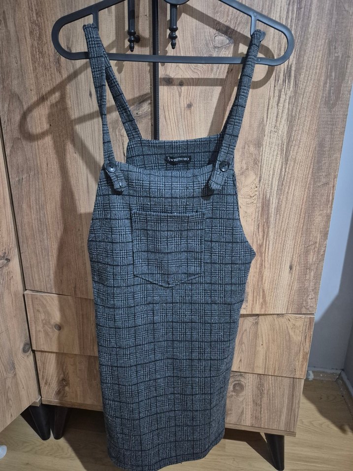 Gri kareli desenli, ayarlanabilir tokalı askılara sahip tulum Regular fit ve street wear tarzında.