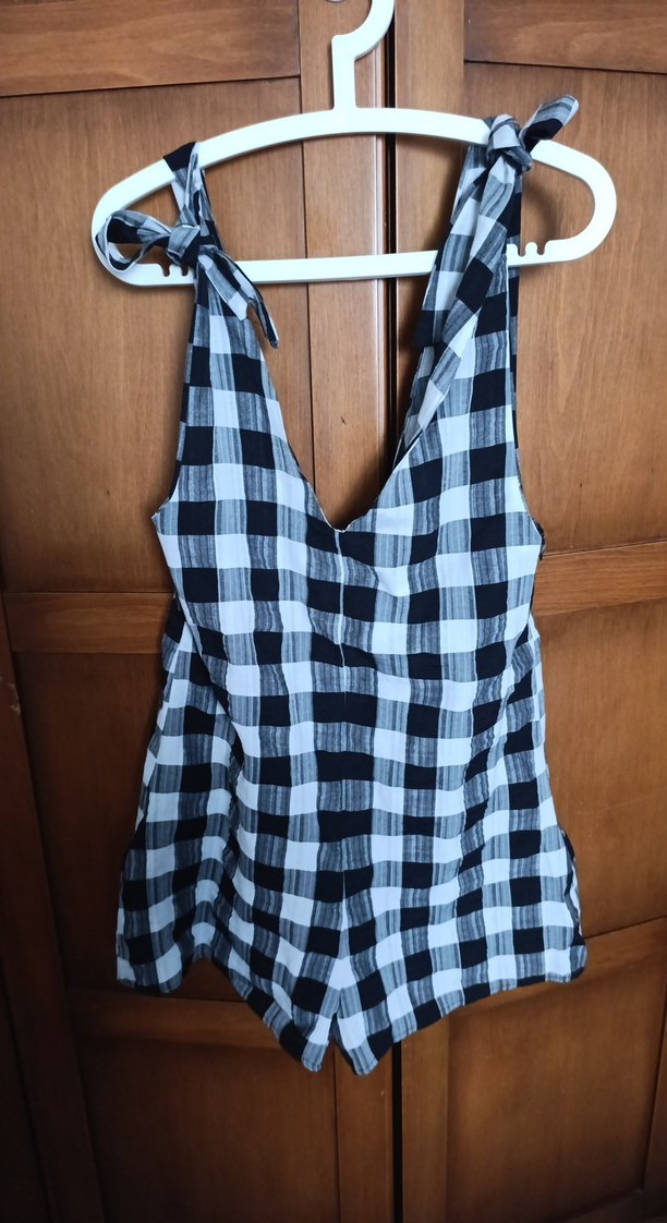 Gri kareli, askılı ve kolsuz kumaş tulum. Belinde tokalı detay ve midi boy, rahat ve vintage tarzda günlük kullanım için uygun.