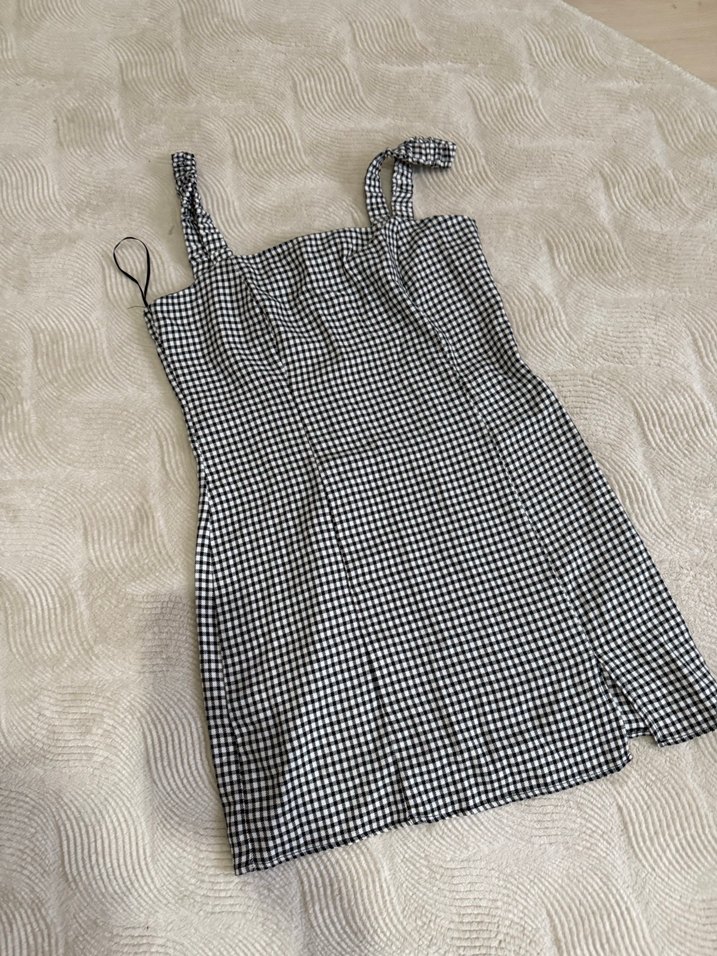 Gri tonlarda kareli, askılı ve düğmeli detaylı, ince kesim mini elbise. Teknolojik kumaştan, günlük sokak tarzı için uygun.