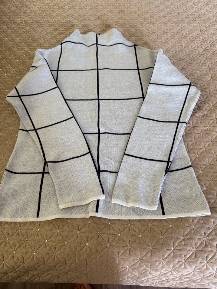 Gri renkli, kare desenli ve boğazlı örme kadın kazak. Uzun kollu, normal kesim, günlük kullanıma uygun.