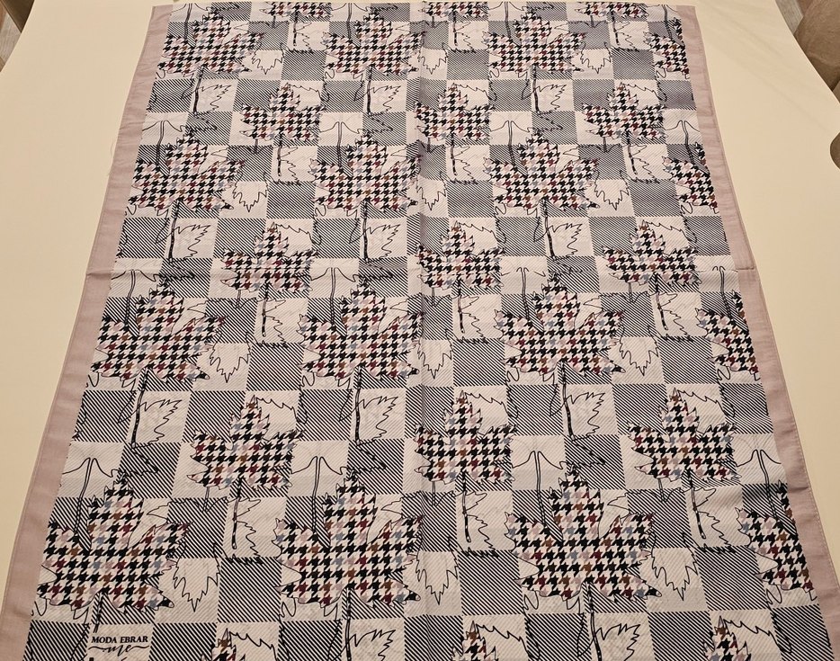 Bu çağdaş eşarp, gri tonlarında kareli desen ve yaprak motifleri içerir. Her mekâna modern bir dokunuş katar.