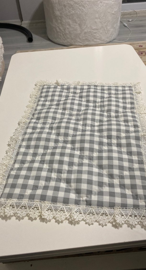 Gri kareli desenli, dantel kenar detaylı geleneksel tarzda demlik altı