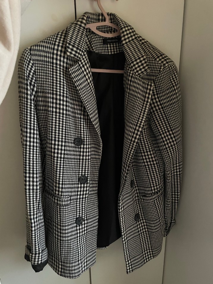 Gri kareli, düğmeli kadın blazer ceket, kesik yaka ve uzun kolludur. Sentetik kumaştan yapılmış, günlük kullanıma uygundur ve rahat bir kesime sahiptir.