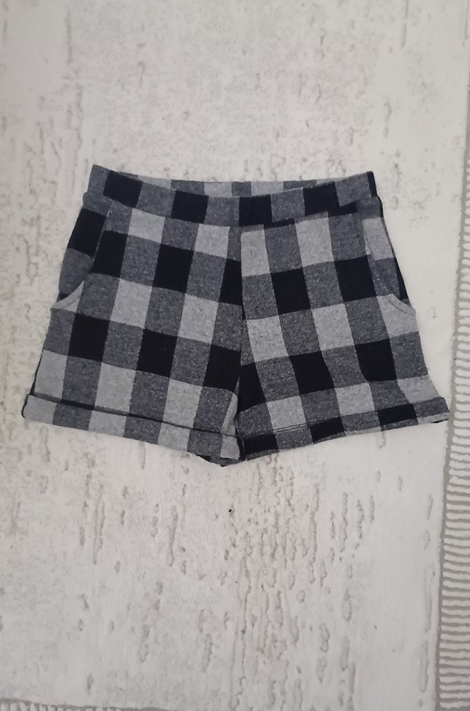 Gri kareli desende, düğmeli ve pamuklu kumaştan üretilmiş bol kesim mini şort. Günlük rahatlık için uygundur.
