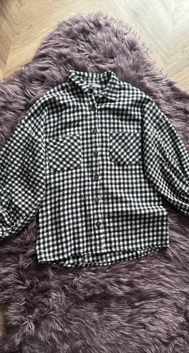 Koyu gri kareli gömlek, düğmeli ön, uzun kollu ve yakalıdır. Rahat kesimli ve pamuklu, konforlu bir sokak stili sunar.