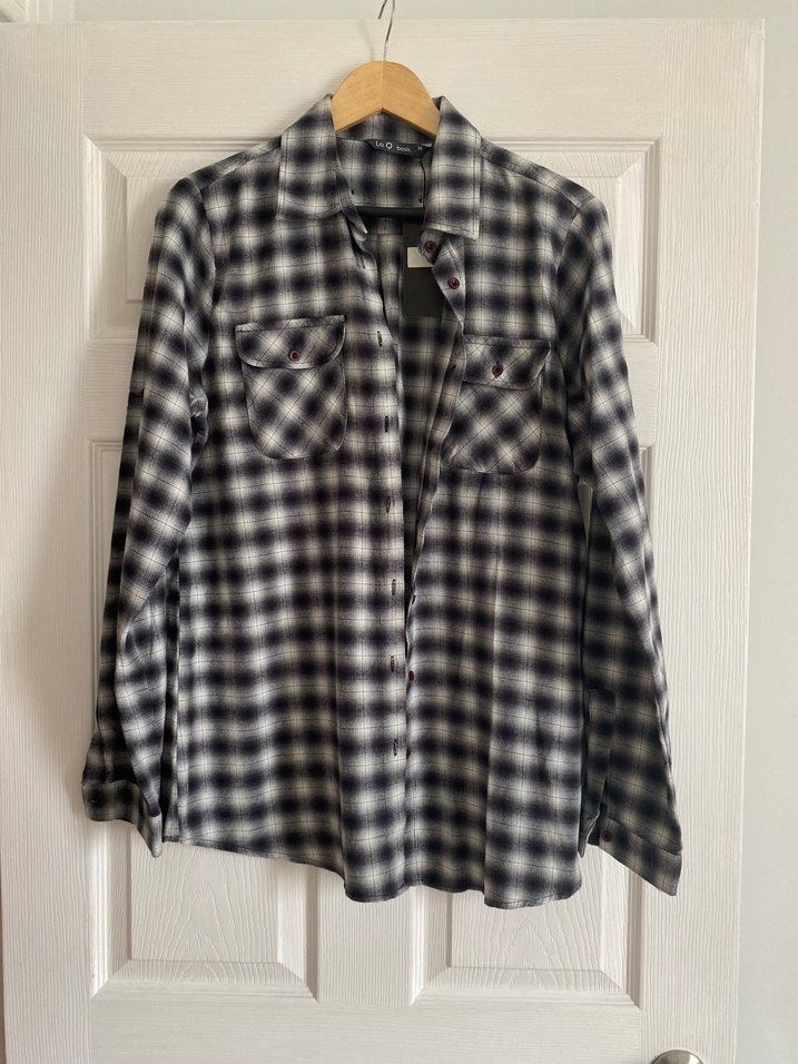 Gri kareli, düğmeli, uzun kollu, yakalı kadın gömleği. Pamuk kumaştan, rahat kesim ve normal boyda, günlük sokak stili için uygun.
