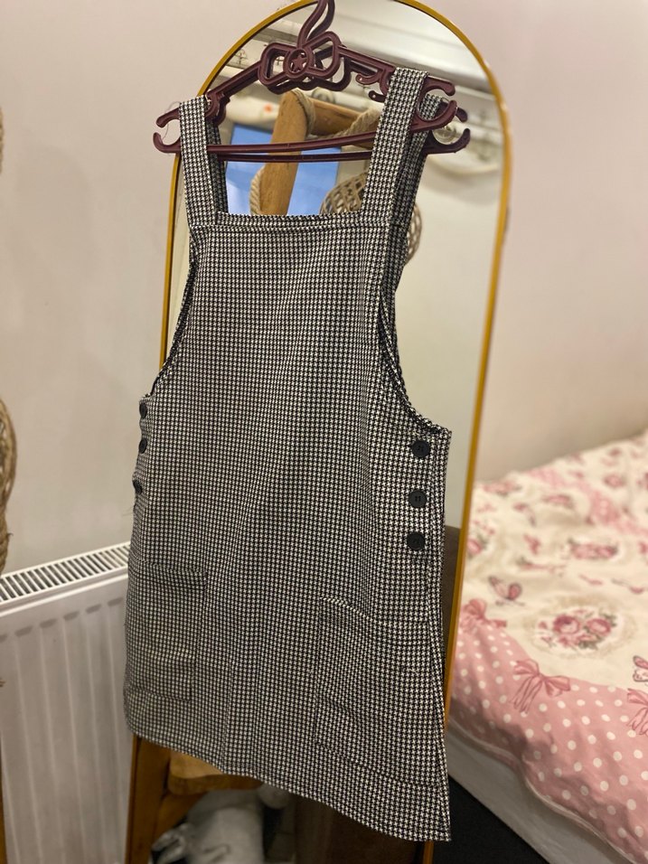 Gri kareli desene sahip, yanlarda düğme detaylı günlük kullanıma uygun elbise. Geniş askılı ve kullanışlı ön ceplidir.