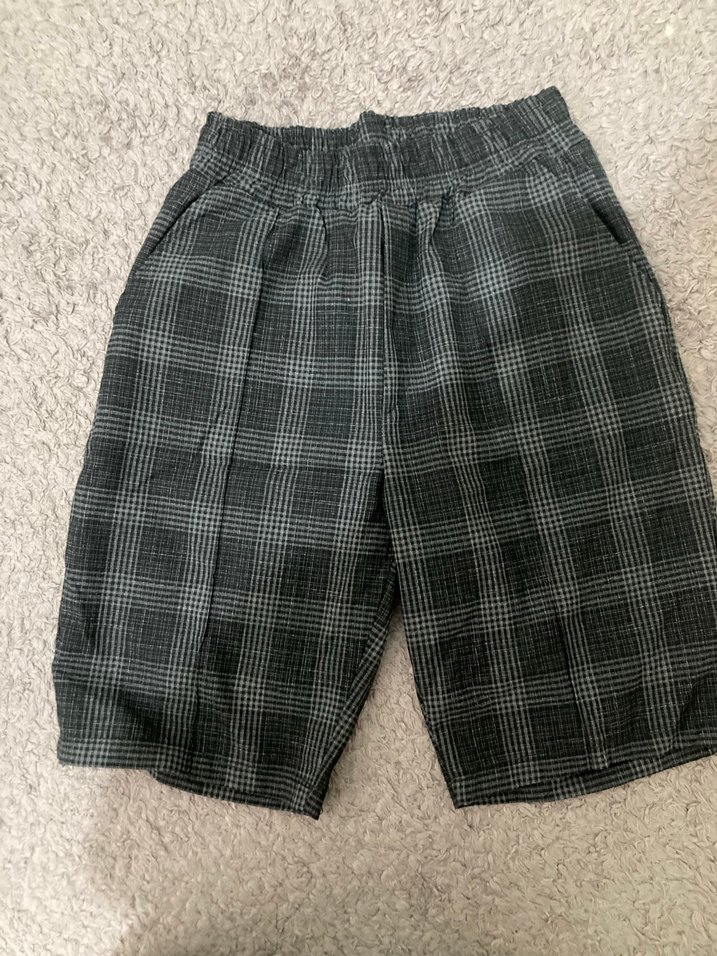 Gri kareli keten kumaştan, bol kesim erkek çocuk şort. Düğmeli ve yan cepli, rahat bir sokak stili sunar.