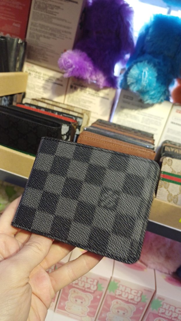 Koyu gri kareli desene sahip erkek cüzdanı, Paris ve karşı kültür tarzını yansıtarak trend bir görünüm sunar.